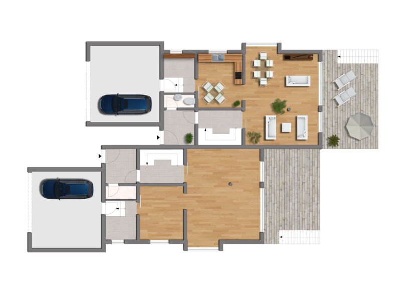 Die großzügigen Doppelgaragen mit elektr. Deckensectionaltoren und Funkfernbedienungen haben einen direkten Zugang zu