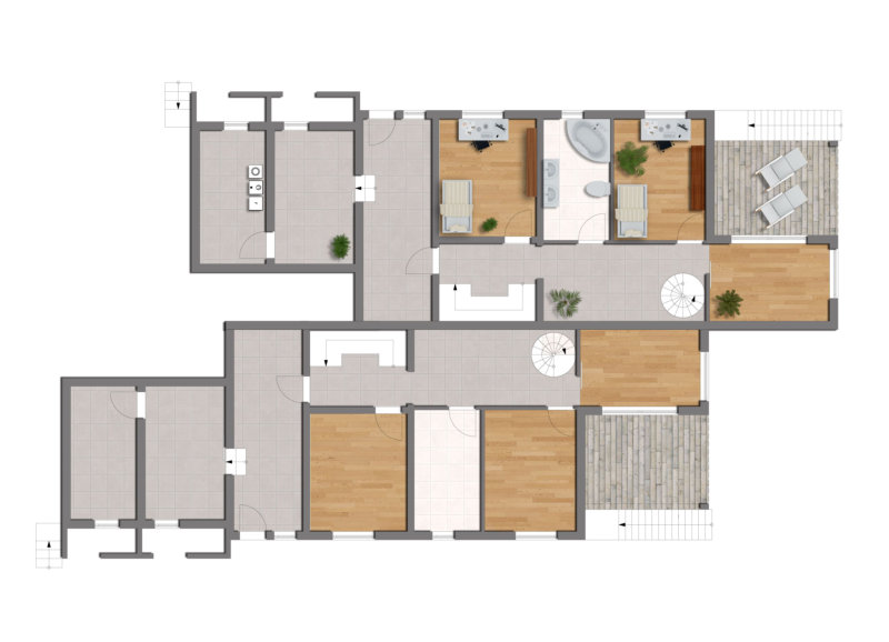 2 Bäder und 1 separates Gäste WC sowie z.B. Kellerräume, Wirtschaftsräume und Vorratsräume zur Verfügung.